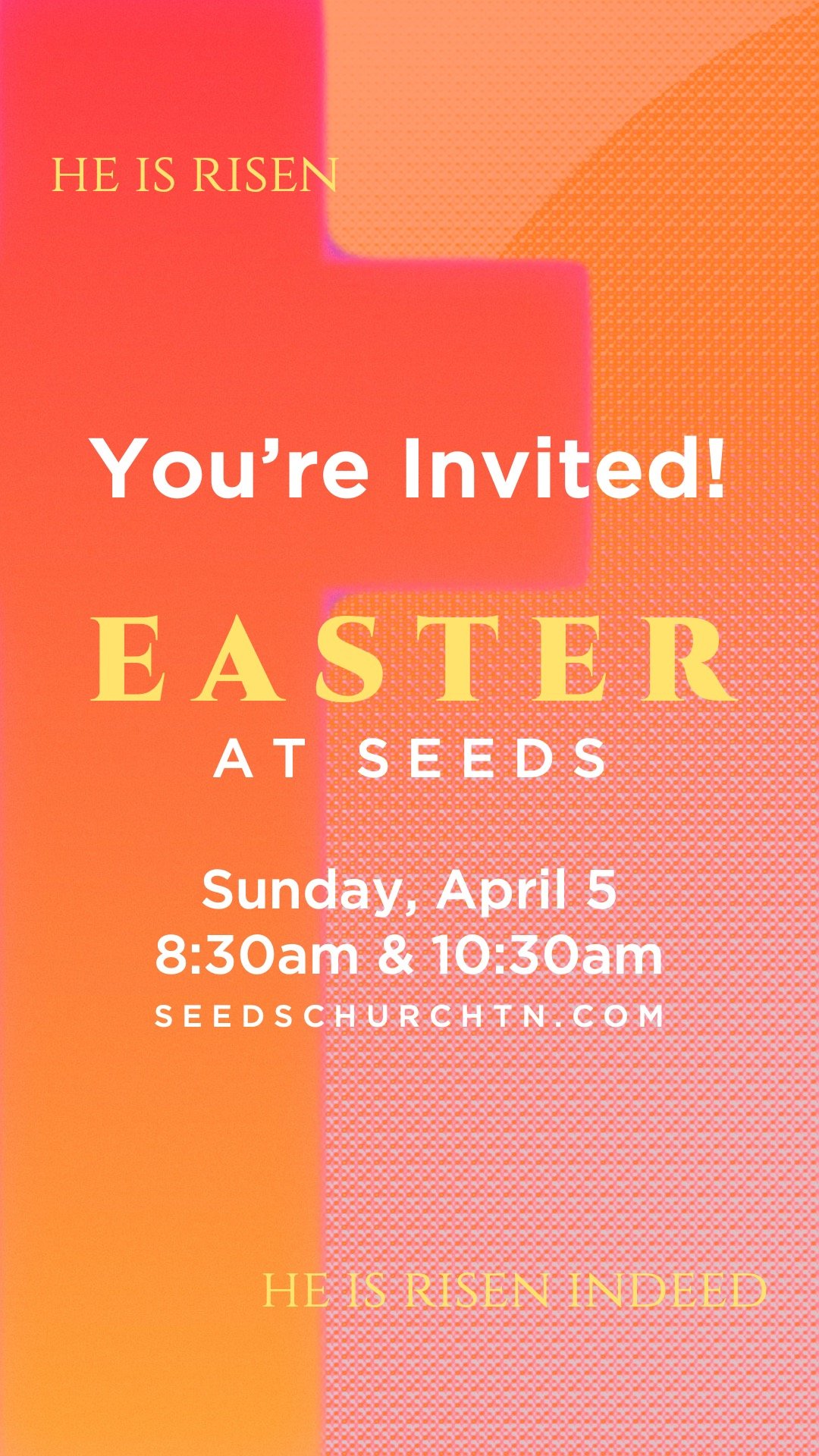 Hi! Want to come to Seeds Church with me for Easter? You can see the service times here. Let me know what works for you, and I’ll save you a seat! seedschurchtn.com/easter